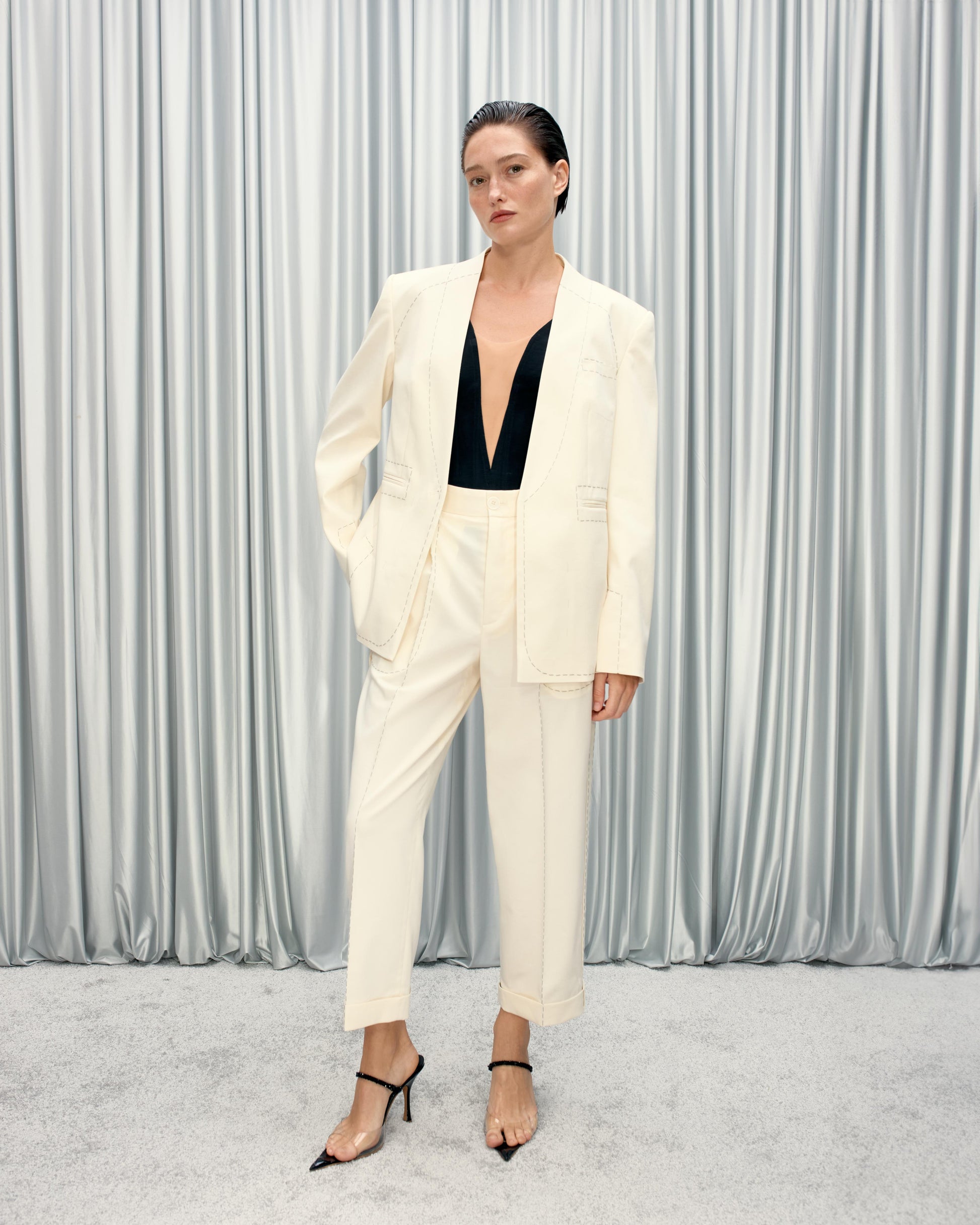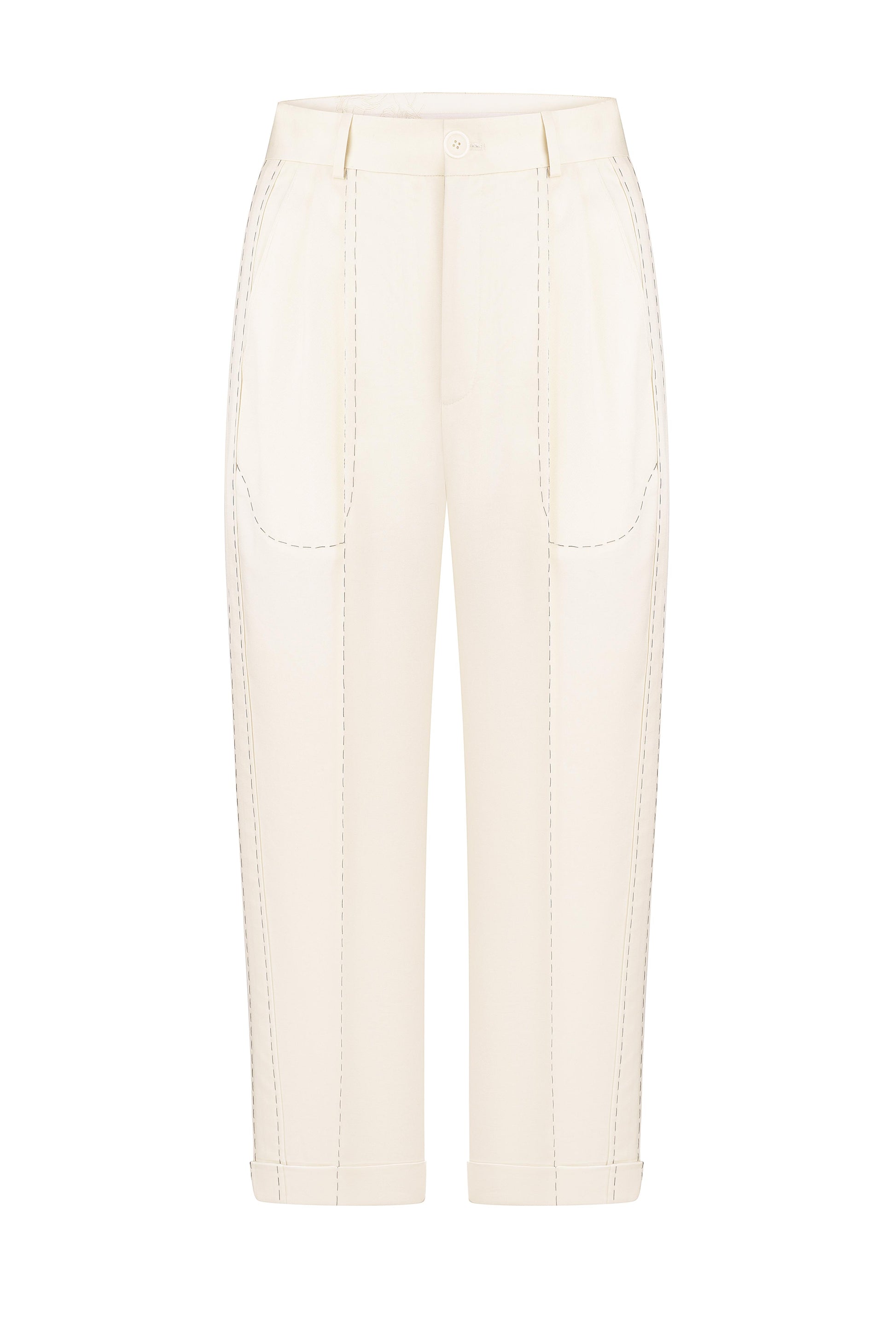 Stitched trousers with transparent pockets